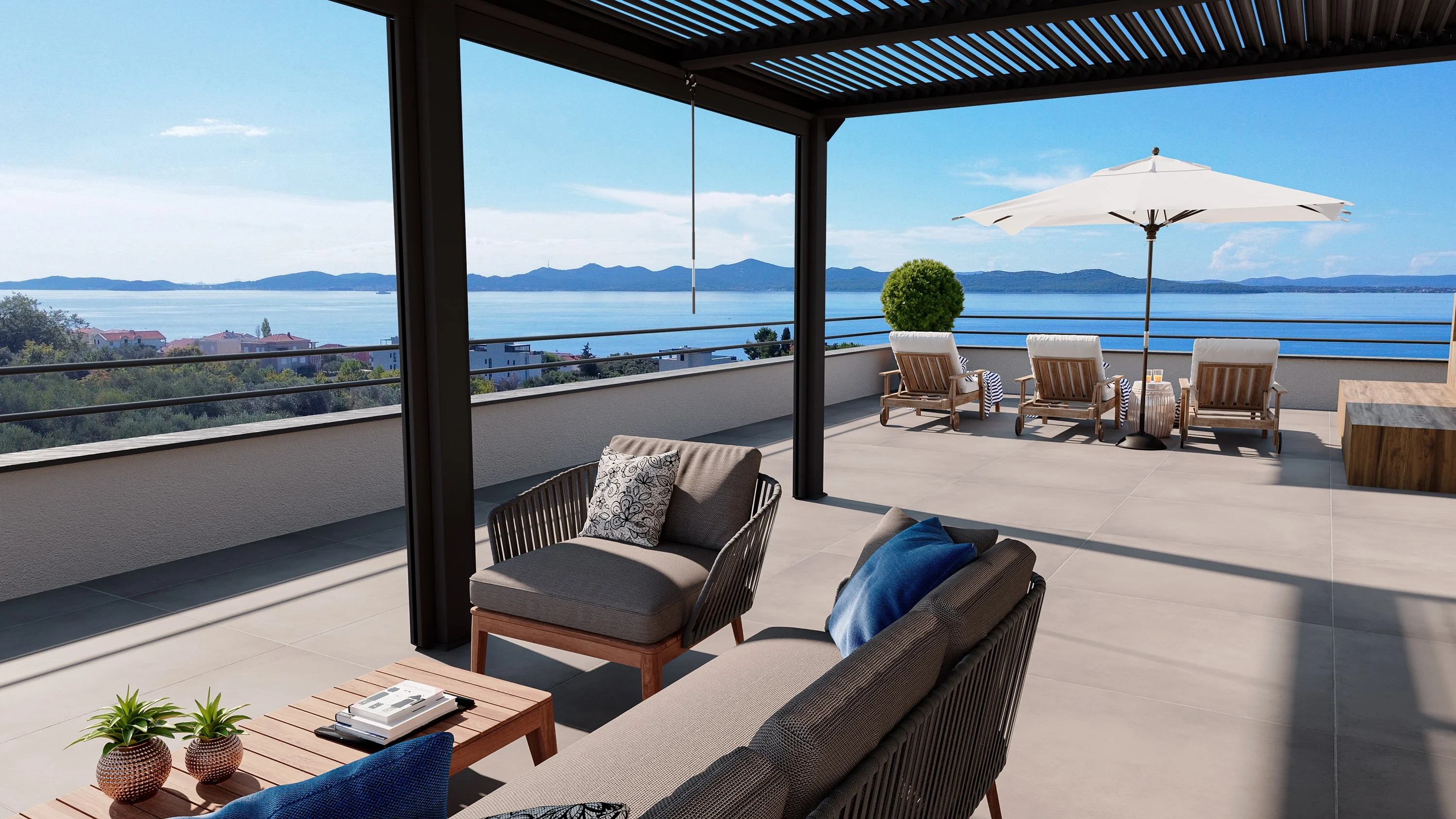 The buildings are oriented toward the sea, ensuring that views of the olive groves and the horizon remain the dominant visual experience from both interior and exterior spaces. Floor-to-ceiling sliding glass doors blur the boundary between inside and out, allowing living areas and terraces to function as a single continuous space. Tiered living responds directly to the site’s topography, with ground-floor residences opening onto private gardens, upper units benefiting from deep balconies, and penthouse levels crowned with expansive roof terraces featuring pergolas and open views across the archipelago.