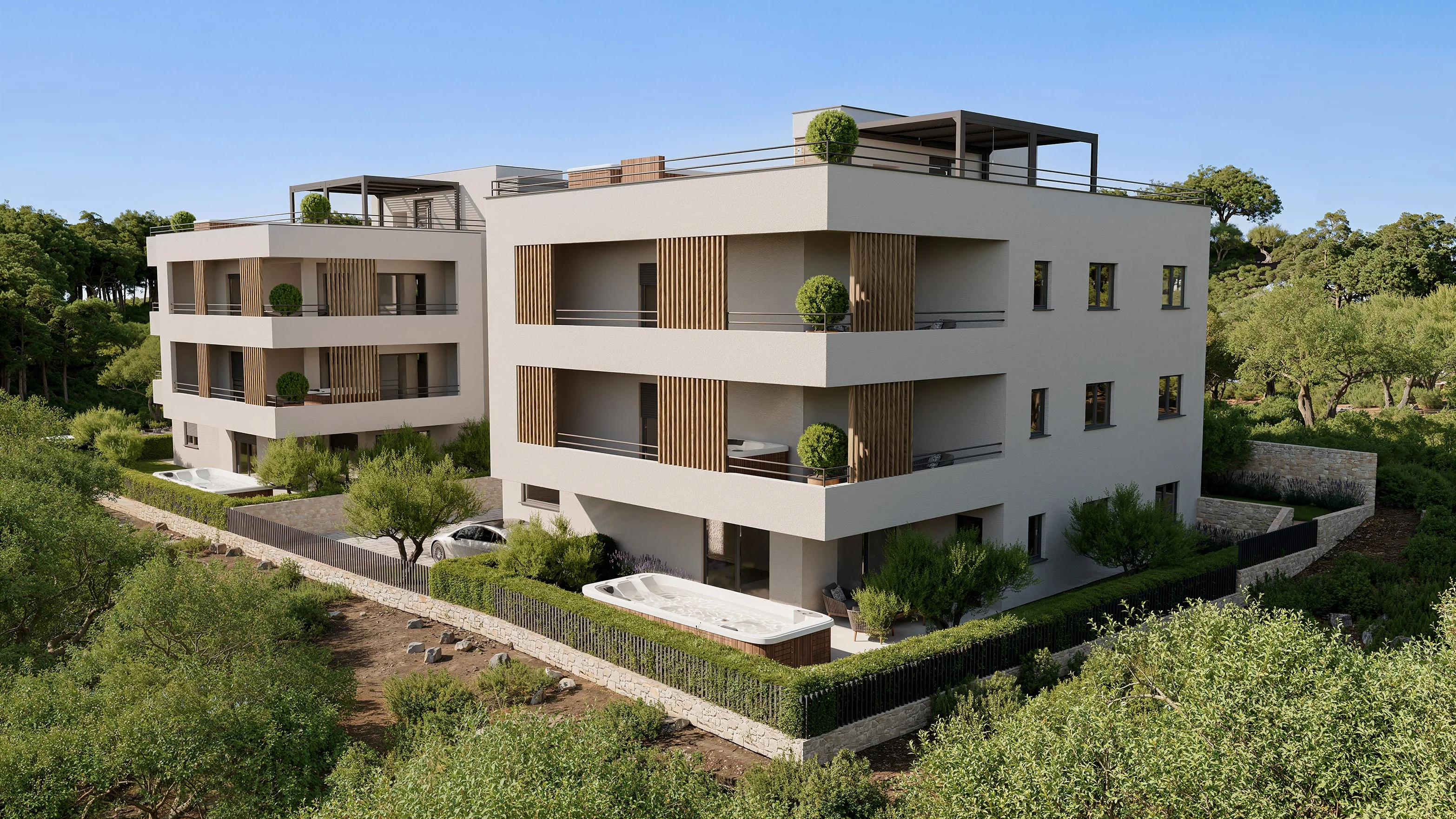 A key challenge was to integrate the buildings into the sloping landscape while protecting and reusing the existing olive trees, which later became an integral part of the garden design. Generous outdoor spaces, expansive terraces, and large gardens were carefully planned to allow residents to experience the surrounding nature and uninterrupted views at every level.