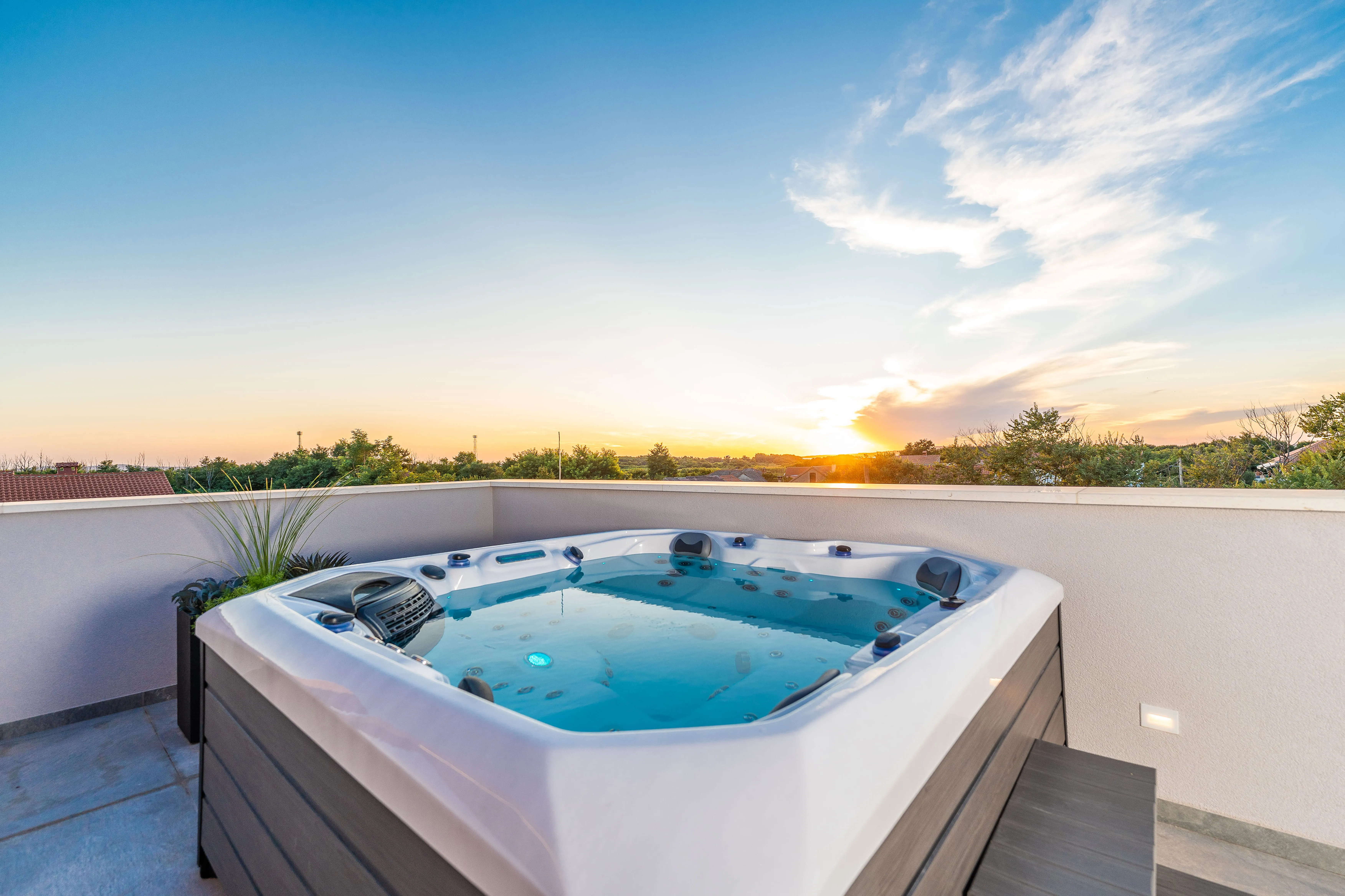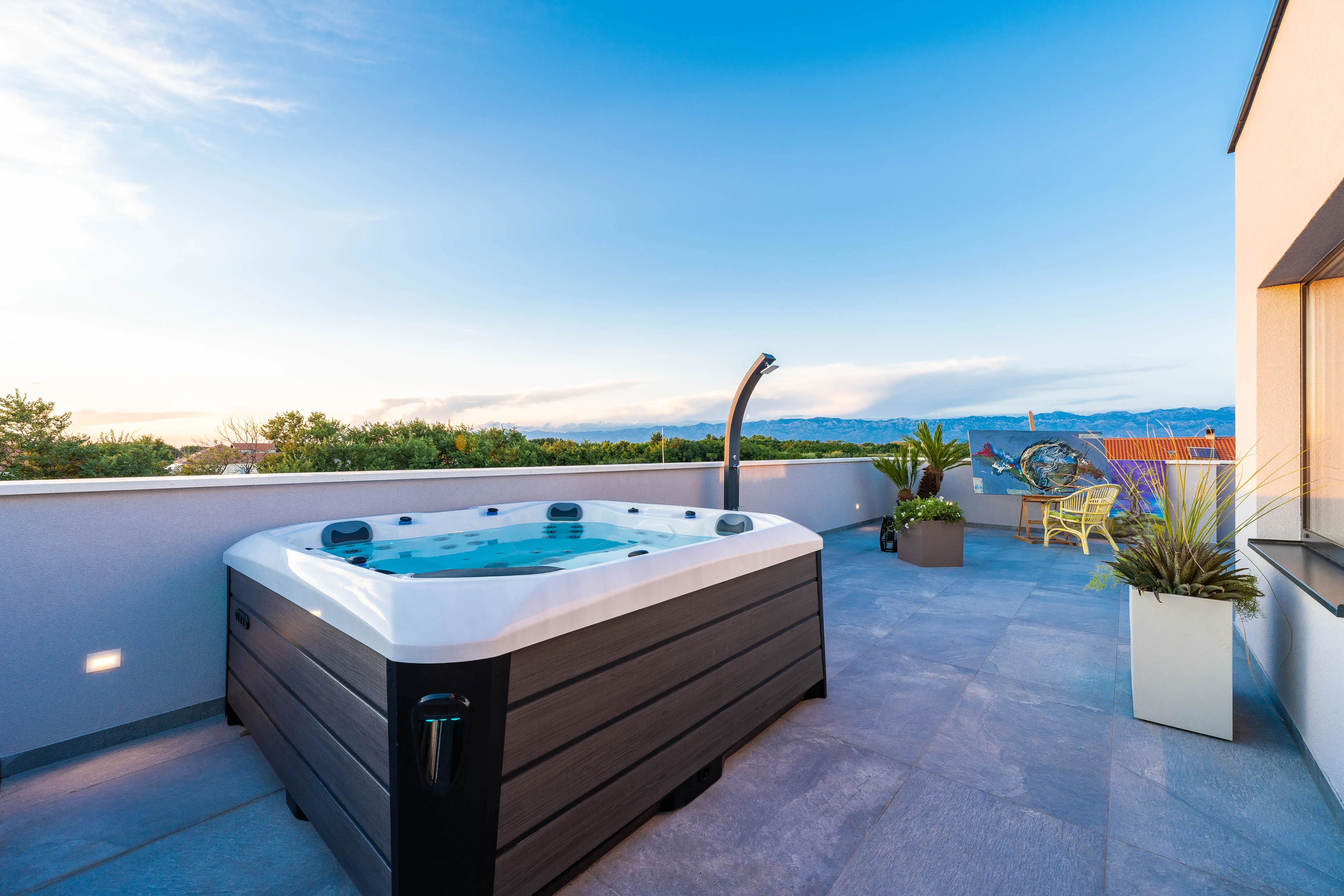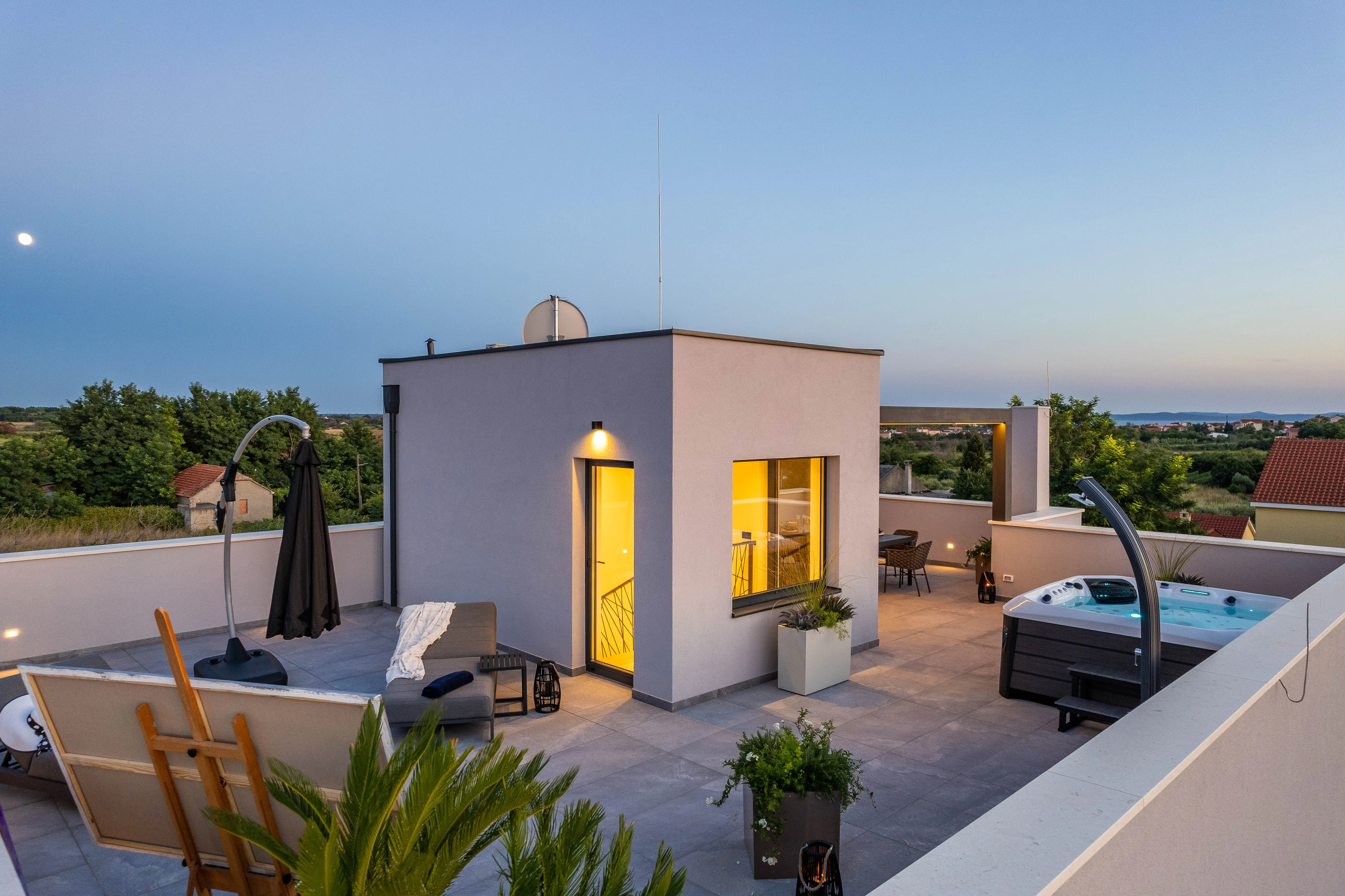 The spatial organization unfolds vertically across three levels. The ground floor is dedicated to social living, opening directly onto the pool terrace and outdoor dining areas. Private bedroom suites occupy the first floor, each with sheltered balconies, while the rooftop functions as an elevated living space with a jacuzzi, outdoor kitchen, and lounge designed for panoramic views of the sea and the Velebit mountain range.